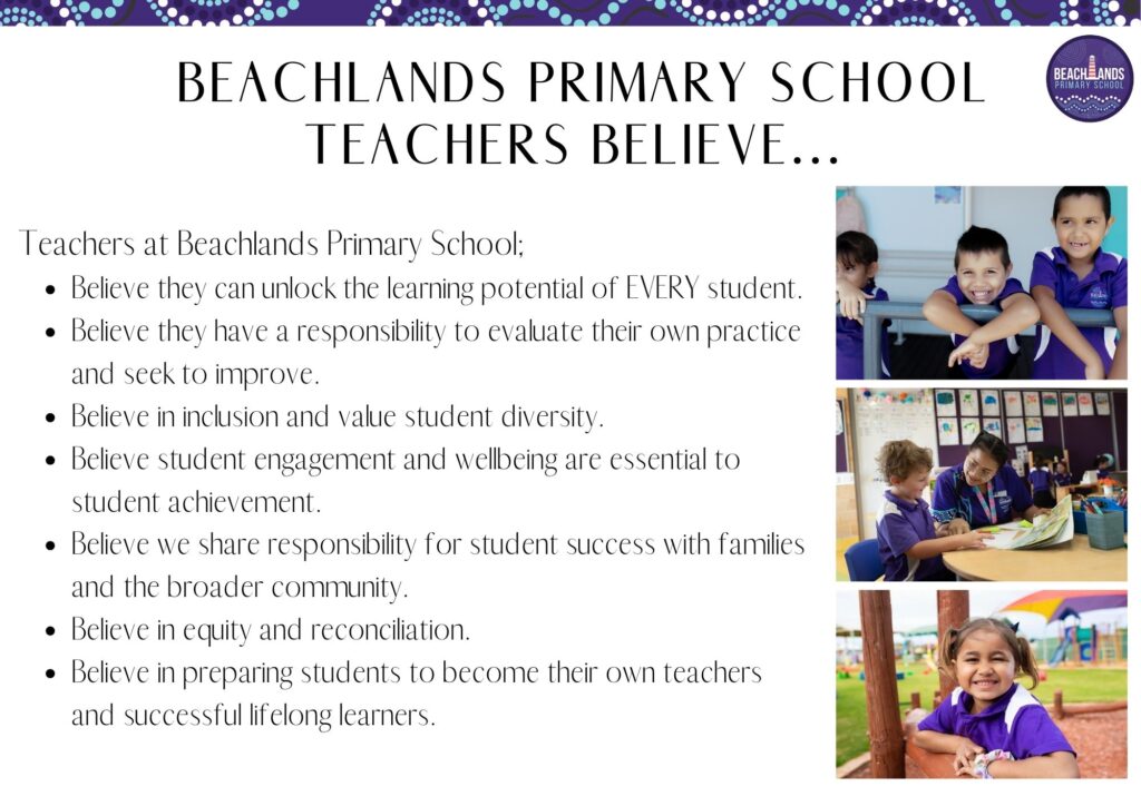 Beachlands Primary School prides itself on delivering evidence-based teaching practices that allow our students to achieve to the best of their ability. Our staff are committed to an instructional framework that aligns with the WA Education Department’s “Teaching for Impact” document. This outlines what effective teachers believe, know and do to have a high impact on student outcomes.